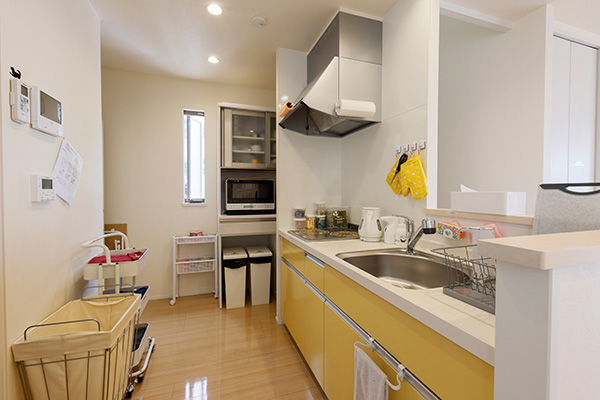 冷蔵庫、2口IHコンロ、電子レンジ、トースター、炊飯器、鍋、フライパン、トング、フライ返し、包丁、おたま、菜箸、まな板、ボール、ざる、土鍋、カセットコンロ、ホットプレート、割り箸、フォーク、ナイフ、スプーン、マグカップ、グラス、湯のみ、皿、大皿、お茶碗、汁碗、キッチンペーパー、ラップ、アルミホイル、食器用洗剤、スポンジ