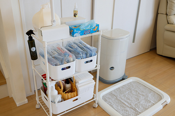 フード及びお水容器、わんちゃん用トイレトレイ、ペットシート(ワイドサイズ)、わんちゃん用足拭き、ウエットテッシュ、消臭剤、粘着コロコロ、ウンチ袋